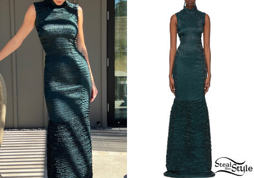 Kendall Jenner radiates elegance in a textured teal maxi dress by Dries Van Noten. The floor-length silhouette features intricate smocking and a high neckline, creating a sophisticated and avant-garde aesthetic perfect for a high-fashion photoshoot. This architectural design highlights her frame with its unique fabric manipulation.