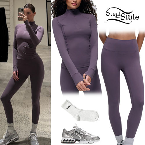 Kendall Jenner showcases a sleek athletic look in a matching violet activewear set featuring a quarter-zip long sleeve top and high-waisted leggings. The monochromatic gym ensemble is paired with white crew socks and metallic Nike Air Zoom Spiridon Cage 2 sneakers for a functional yet stylish finish. This look perfectly balances high-performance gear with contemporary street-style aesthetics.