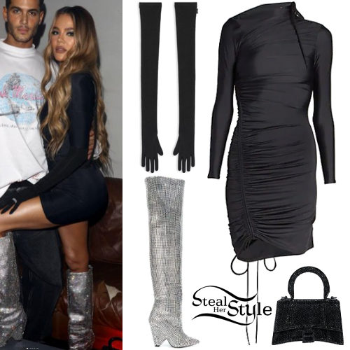 Khloe Kardashian makes a bold statement in a black ruched mini dress paired with high-fashion accessories. She elevates the look with shimmering Saint Laurent crystal-embellished boots and long opera-style stretch gloves for a high-glamour aesthetic. A matching rhinestone Balenciaga bag completes this striking evening ensemble.