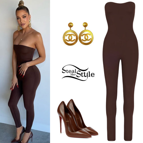 Khloe Kardashian showcases a sleek and monochromatic aesthetic featuring a chocolate brown Skims All-In-One Strapless Onesie. She elevates the minimalist look with iconic Chanel gold charm hoop earrings and matching Christian Louboutin So Kate leather pumps. This tight-fitting ensemble perfectly blends high-fashion accessories with a modern, sculpted silhouette.