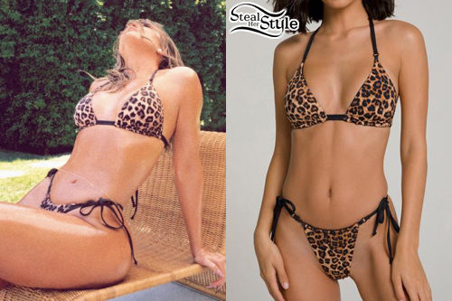 Khloe Kardashian showcases a bold summer look in this leopard print string bikini. The ensemble features the Hi-Hi Tanga reversible top and matching side-tie bottoms, perfect for a high-cut, glamorous poolside aesthetic.