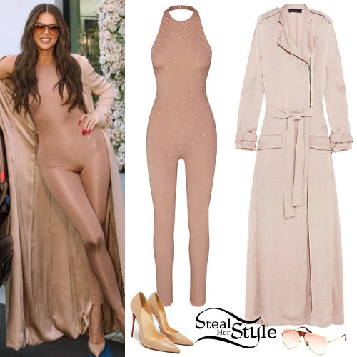 Khloe Kardashian makes a bold monochrome statement in a nude, crystal-embellished halter jumpsuit paired with a matching floor-length duster coat. She elevates the sleek ensemble with classic Christian Louboutin So Kate snakeskin pumps and oversized Tom Ford aviator sunglasses for a high-fashion look.