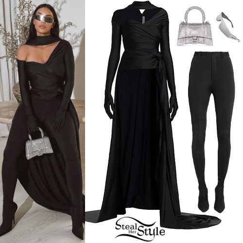 Kim Kardashian makes a bold statement in a sculptural Balenciaga ensemble featuring a black choker evening set with a dramatic train. She pairs the avant-garde top with signature spandex skinny pantashoes and elevates the look with a sparkling crystal-embellished Hourglass bag. Futuristic silver sunglasses add a final touch of high-fashion edge to this striking monochromatic silhouette.
