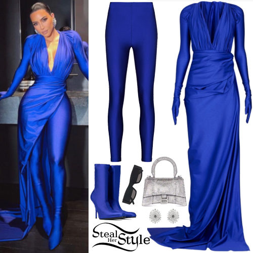 Kim Kardashian makes a bold statement in a vibrant electric blue Balenciaga couture set featuring a draped low-neck bodice and matching leggings. She elevates the monochrome look with pointed-toe boots and high-shine silver accessories, including a crystal-encrusted Hourglass bag. This avant-garde ensemble perfectly balances high-fashion drama with a sleek, futuristic silhouette.