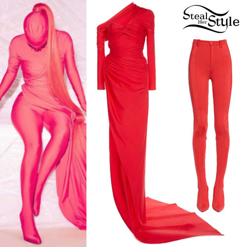 Kim Kardashian makes a bold statement in a monochromatic red Balenciaga ensemble. This striking look features a draped jersey one-shoulder gown layered over the brand's signature pantashoes, creating a seamless and avant-garde silhouette. The vibrant scarlet hue and unique fabric manipulation showcase her experimental approach to high fashion.