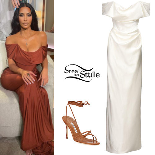 Kim Kardashian exudes timeless glamour in an rust-toned Vivienne Westwood Cocotte dress featuring a dramatic draped neckline. She pairs the elegant satin gown with delicate Manolo Blahnik Leva wrap-around sandals for a sophisticated finish. This look perfectly captures a blend of classical silhouette and modern luxury.