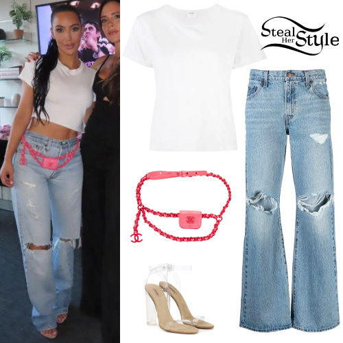 Kim Kardashian masters high-low styling in a classic Re/Done x Hanes white boxy t-shirt paired with distressed light-wash flare jeans. The minimalist look is elevated with a vibrant pink Chanel AirPods Pro holder belt and transparent Gianvito Rossi heels for a modern touch.