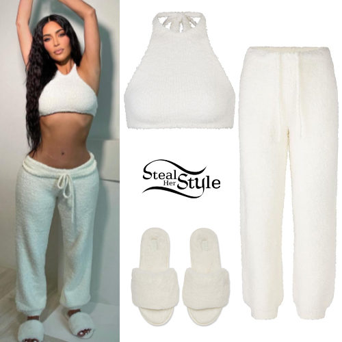Kim Kardashian showcases ultimate loungewear goals in this all-white Skims ensemble. The relaxed look features a fuzzy knit halter bra top paired with matching high-waisted joggers and plush slides for a monochromatic, cozy aesthetic.