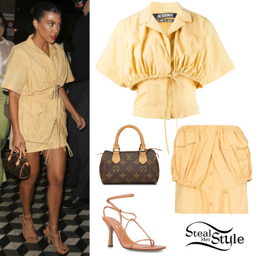 Kourtney Kardashian makes a vibrant statement in a yellow Jacquemus gathered poplin top paired with a matching layered mini skirt. She accessorizes the monochromatic set with strappy Bottega Veneta sandals and a vintage Louis Vuitton monogram mini handbag for a sophisticated evening look.