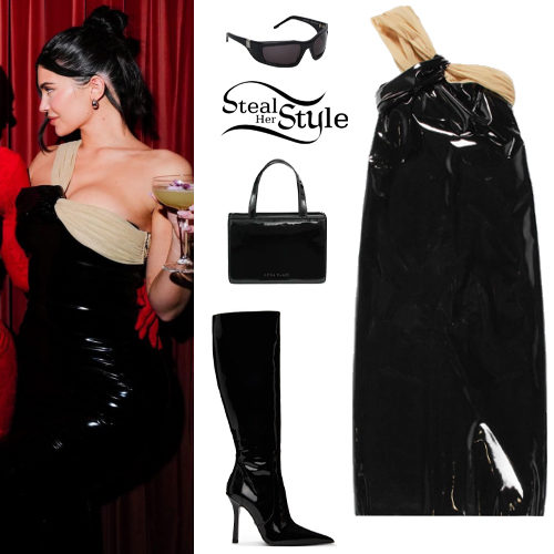 Kylie Jenner makes a bold statement in a high-shine black patent PVC dress featuring a unique draped tan neckline. She completes the edgy look with Blumarine pointed-toe boots and an Amina Muaddi handbag for a high-fashion party aesthetic.