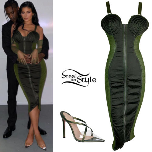 Kylie Jenner stuns in a vintage-inspired look featuring an iconic '87 Jean Paul Gaultier green sheer bandage wiggle dress with its signature cone bra silhouette. She paired the archival piece with sleek Andrea Wazen PVC pumps for a modern, high-fashion finish. This avant-garde ensemble perfectly balances retro couture with contemporary trends.