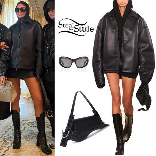 Kylie Jenner showcases an edgy avant-garde look featuring a Balenciaga Fall 2022 oversized leather jacket paired with sleek square-toe boots. She completes the monochromatic ensemble with signature wrap-around sunglasses and an Owena medium shoulder bag.