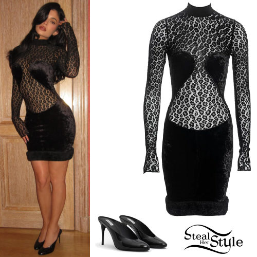 Kylie Jenner stuns in a vintage-inspired 1991 black velvet and leopard print lace evening dress. She paired the bodycon mini dress with sleek pointed-toe patent leather decollete mules for a sophisticated yet bold nocturnal look.