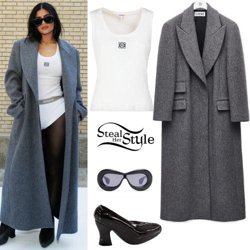 Kylie Jenner showcases a high-fashion street style moment featuring a structured Loewe long grey wool coat layered over a clean white logo tank top. She completes the avant-garde aesthetic with inflated mask sunglasses and statement black patent heels for a modern, minimalist look. This ensemble perfectly balances oversized tailoring with sleek, contemporary staples.
