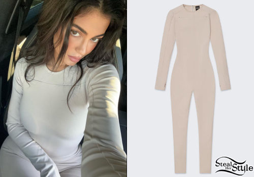 Kylie Jenner keeps it sleek and comfortable in this form-fitting long-sleeve catsuit. The neutral-toned piece features a mock chest seam and a streamlined silhouette that highlights her signature style. This effortlessly chic look is the ultimate masterclass in minimalistic athleisure attire.
