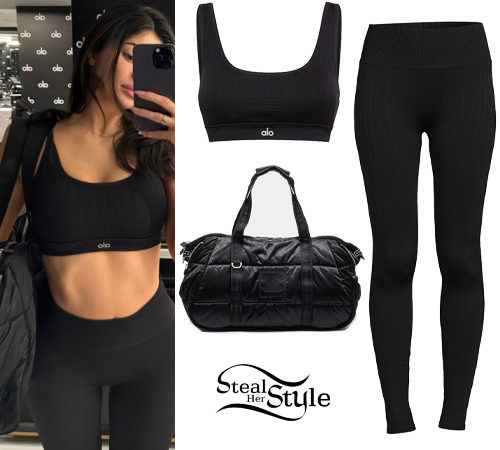 Kylie Jenner showcases a sleek athletic look in a matching Alo Yoga seamless cable knit set. This monochromatic gym ensemble features a scooped sports bra paired with high-waisted ribbed leggings and a vintage Chanel nylon duffle bag for a touch of luxury.