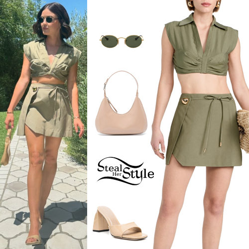 Lucy Hale embraces a chic summer aesthetic in this olive green coordinated set. She pairs a structured Jeanette crop top with a matching Tov wrap mini skirt, accessorized with a beige Amber bag and patent-leather mules for a perfect warm-weather look.