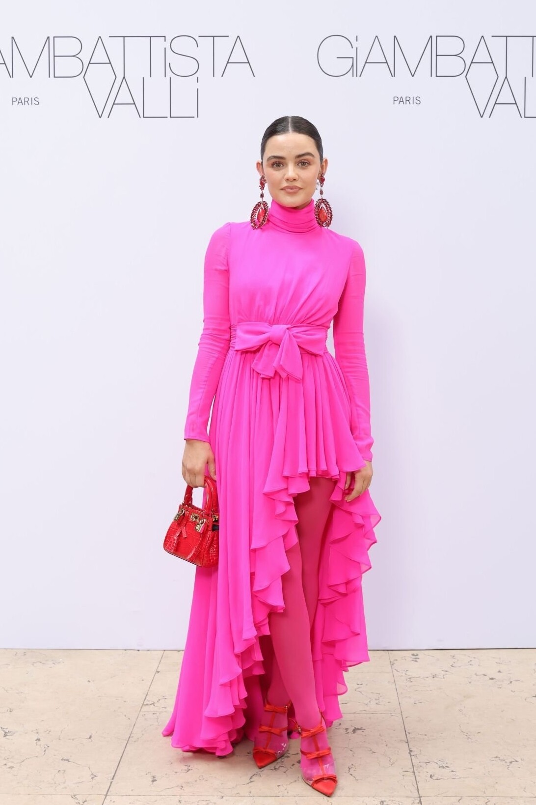 Lucy Hale makes a bold statement at the Giambattista Valli show in a vibrant bougainville pink draped jersey gown featuring a high-low ruffled hem. She punctuates the monochromatic look with striking red accents, including an oversized pair of earrings, a croc-embossed mini bag, and multi-bow stiletto pumps.