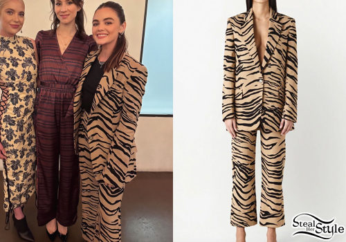 Lucy Hale makes a bold statement in a striking zebra-print power suit. The ensemble features an oversized jacquard wool-blend blazer paired with matching cropped flared pants for a modern, animal-inspired look. This daring set showcases a perfect balance of high-fashion tailoring and playful textures.