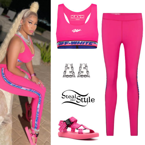 Nicki Minaj serves a bold athleisure look featuring a vibrant pink Off-White logo sports bra paired with matching high-rise logo leggings. The iconic rapper accessorizes the sporty ensemble with Fendi 'Prints On' bamboo earrings and chunky pink logo-print sandals for a coordinated finish.