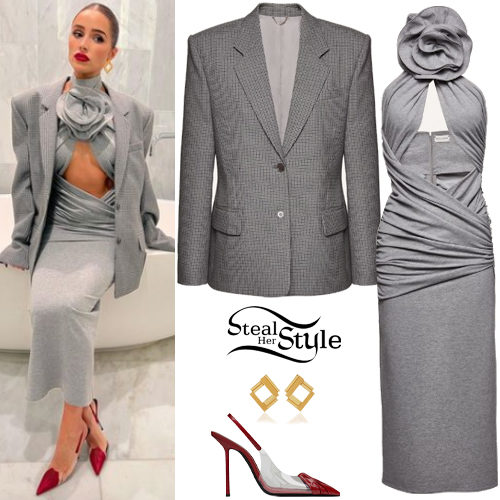 Olivia Culpo showcases a masterclass in modern power dressing with this monochromatic grey ensemble. She pairs a dramatic cutout halter midi dress featuring a statement rosette neck with an oversized tailored check blazer, finishing the look with striking Saint Laurent red-tipped slingback pumps.