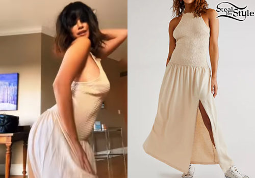 Selena Gomez looks effortlessly chic in a cream smocked halter maxi dress. The relaxed silhouette and high slit make this Free People piece a perfect choice for an easygoing, stylish day in. This look combines comfort with a bohemian flair, highlighting Selena's versatile personal style.
