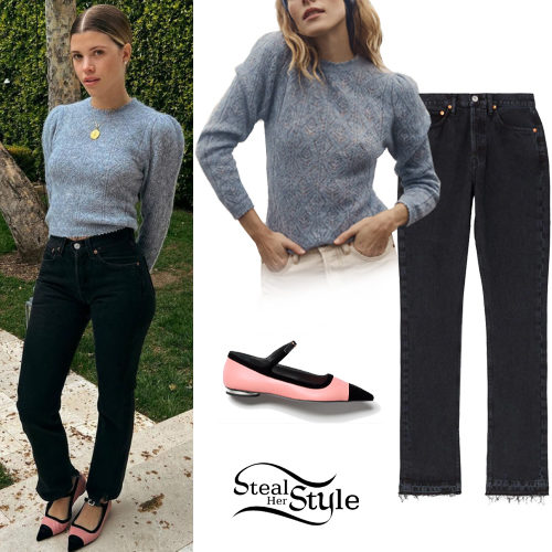 Sofia Richie showcases a sophisticated casual look featuring a grey Doen Carmelina pointelle knit sweater with puff sleeves. She pairs the textured top with high-waisted Re/Done black jeans and striking pink and black pointed-toe Mary Jane flats for a chic finish. This ensemble perfectly blends vintage-inspired knitwear with modern denim staples.
