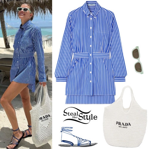 Sofia Richie showcases effortless seaside chic in a blue and white striped mini shirt dress paired with a Prada crochet raffia tote bag. She completes the vacation look with mint-green Celine rectangular sunglasses and blue lace-up shell sandals by The Row.