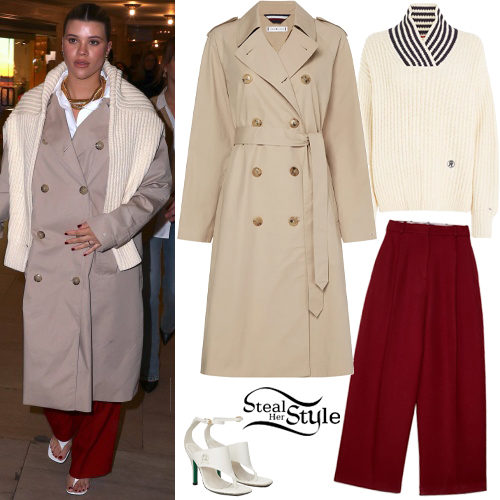 Sofia Richie showcases a masterclass in modern layering with a classic tan trench coat paired with bold red wide-leg trousers. She elevates the look with a monogrammed contrast stripe jumper draped over her shoulders and sleek white stiletto sandals.