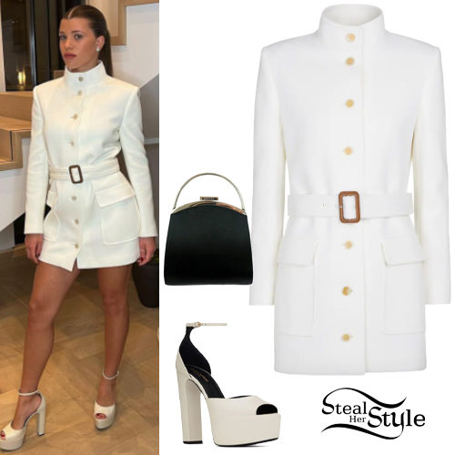 Sofia Richie exudes effortless sophistication in a polished white belted wool-blend jacket dress. She elevates the chic monochromatic look with sky-high white platform sandals and a classic Gucci satin top-handle bag.