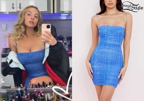 Sydney Sweeney keeps it chic and casual behind the scenes in a House of CB Ella sky blue printed ruched organza mesh mini dress. The vibrant blue piece features delicate spaghetti straps and a body-hugging silhouette, styled effortlessly with an oversized jacket for a cool, off-duty aesthetic.