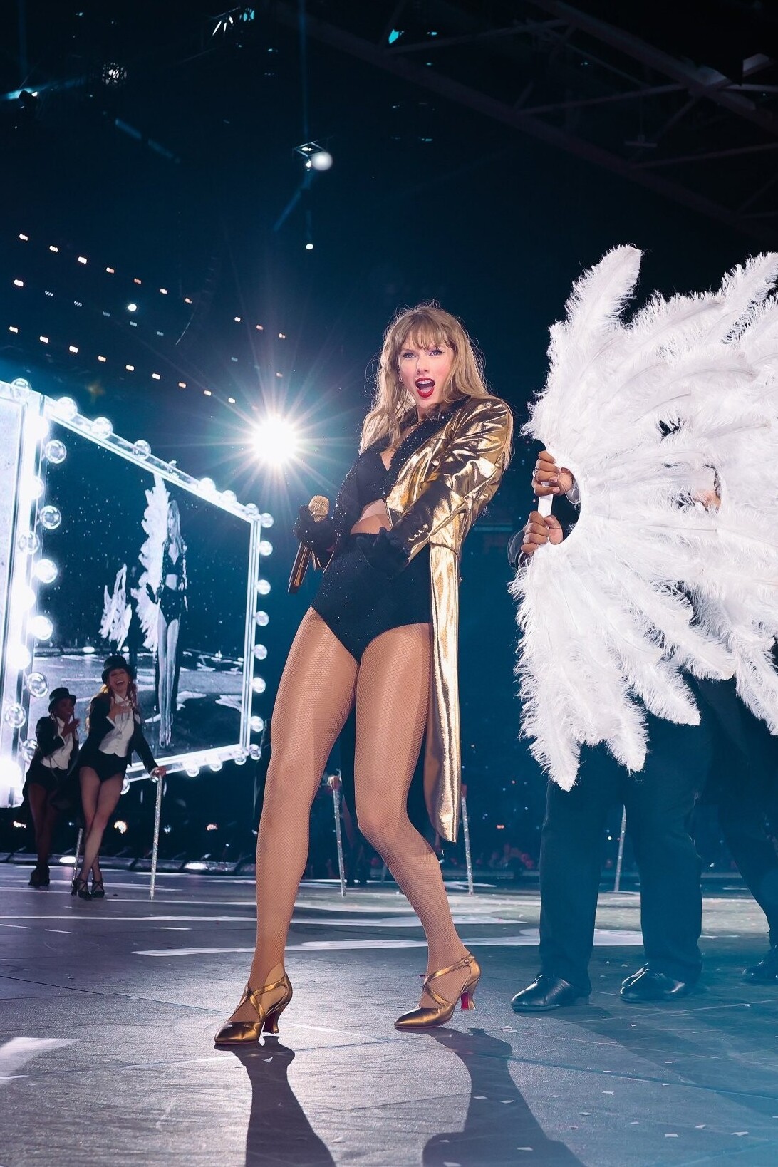 Taylor Swift dazzles during The Eras Tour in London wearing a custom Vivienne Westwood ensemble. The look features a shimmering gold tailcoat layered over a sleek black custom bra and high-waisted shorts, finished with her signature Christian Louboutin heels and bold red lip.