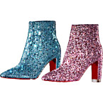 Taylor Swift dazzles on stage in a custom Roberto Cavalli two-piece set featuring a shimmering pink beaded crop top and a teal-to-blue ombré sequin skater skirt. The pop star completed the vibrant look with custom mismatched Christian Louboutin glitter boots and her signature red lip. This sparkling ensemble perfectly captures the high-energy aesthetic of the 1989 era during her Eras Tour performance.