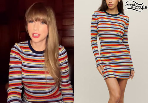 Taylor Swift looks effortlessly chic in a multi-colored Reformation Leone cashmere sweater mini dress. This ribbed knit piece features a classic crew neckline and long sleeves, making it a perfect example of her signature cozy-yet-polished style. The vibrant horizontal stripes add a playful retro touch to this versatile cold-weather ensemble.