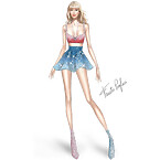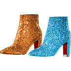 Taylor Swift sparkles on stage during The Eras Tour in a custom Roberto Cavalli two-piece set featuring an orange sequin crop top and a teal ombre mini skirt. She pairs the vibrant stage ensemble with custom Christian Louboutin glitter boots and Shimmery Capezio tights for a high-energy performance. Her signature red lip and glamorous waves complete this iconic 1989-era concert look.