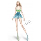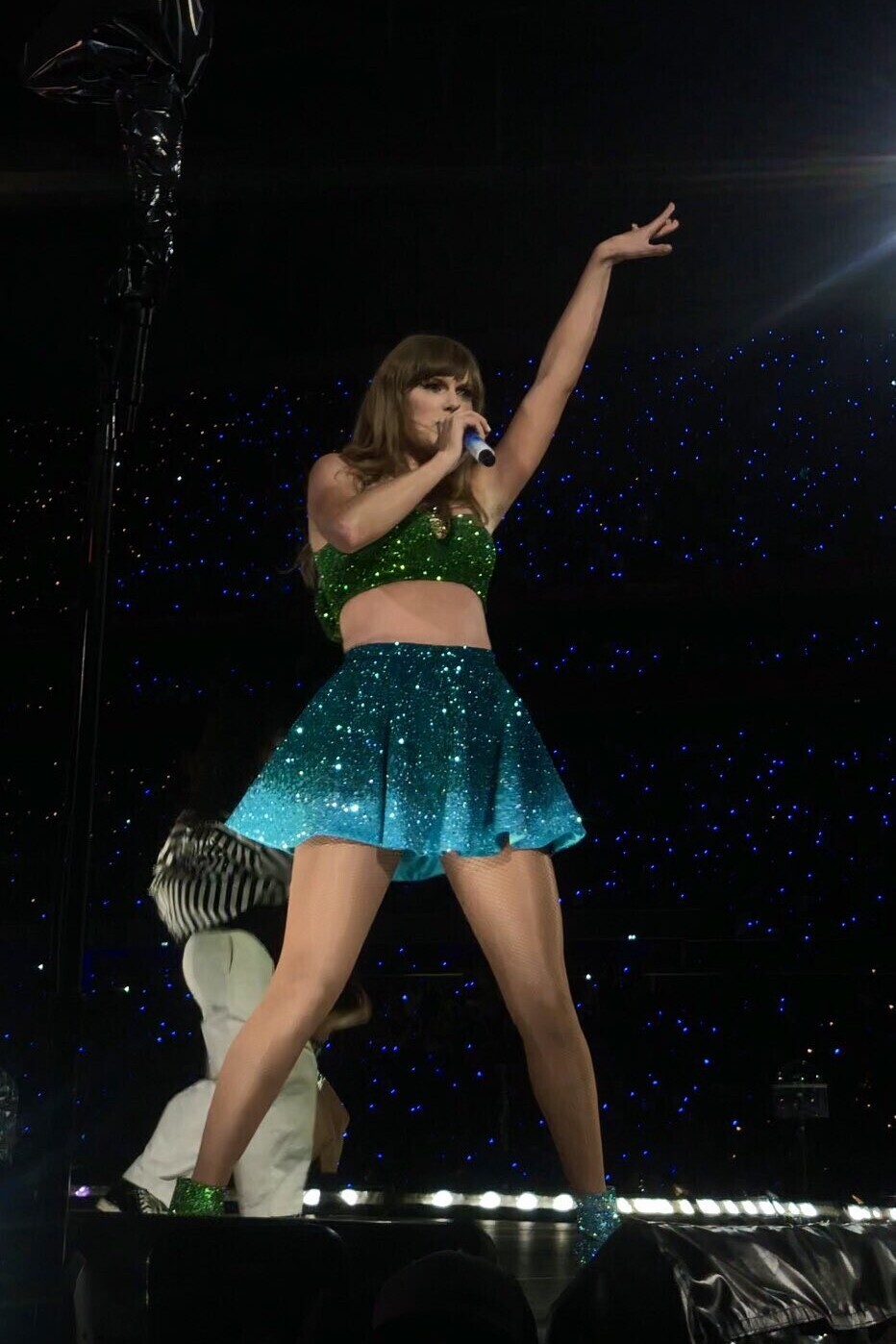 Taylor Swift shines on stage in a custom Roberto Cavalli two-piece set featuring vibrant green and azure blue sequins. The look is complete with matching ombré Christian Louboutin boots and her signature Red-era inspired bangs for a playful, prismatic concert aesthetic.