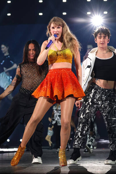 Taylor Swift performs during The Eras Tour wearing a custom Roberto Cavalli ombre sequined set. The vibrant yellow-to-orange gradient outfit features a cropped bustier top paired with a matching tiered mini skirt and custom sparkling Louboutin boots.