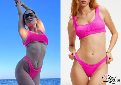 Vanessa Hudgens stuns in a vibrant neon pink ribbed bikini while enjoying a sunny beach day. The ensemble features the Always Fits Scoop Top paired with matching Always Fits Better Cheeky bottoms, creating a bold and athletic swimwear look.