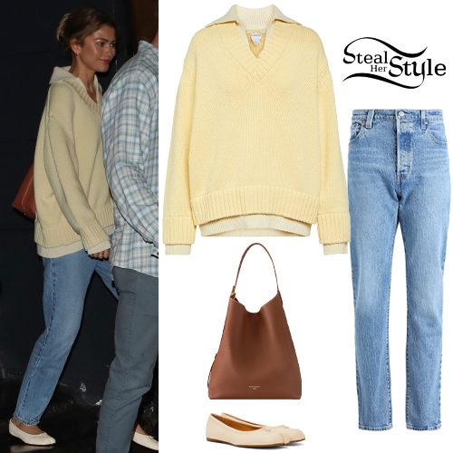 Zendaya masterfully combines comfort and high fashion in this casual street style look. She pairs a cozy layered wool sweater from Bottega Veneta with classic light-wash Levi’s 501 jeans, completing the aesthetic with signature Maison Margiela Tabi flats and a sleek Louis Vuitton hobo bag.