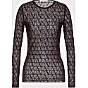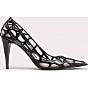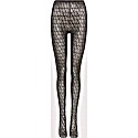 Zendaya makes a bold statement at the Valentino Spring/Summer 2023 show in a head-to-toe monogrammed ensemble. She pairs a crystal-embellished oversized blazer with a sheer Toile Iconographe bodysuit and matching embellished tights for a high-fashion, maximalist look. The outfit is completed with pointed-toe pumps and sparkling pendant earrings, showcasing her fearless approach to luxury style.