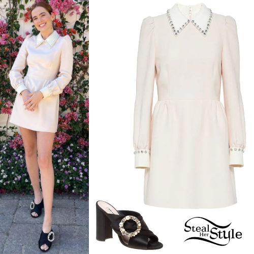 Zoey Deutch looks sophisticated in a pale pink mini dress featuring a contrasting crystal-embellished pointed collar and matching cuffs. She completes the feminine ensemble with black satin peep-toe mules accented with a circular pearl and crystal brooch. The look perfectly balances vintage-inspired charm with modern luxury details.